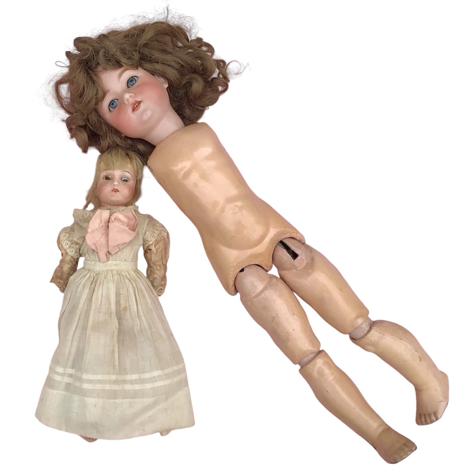 Charming antique large shabby aged German doll. Porcelain head, composition body.