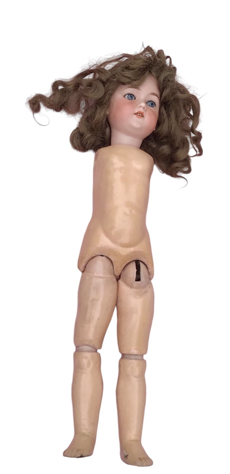 Loose stringing, no arms. Worn legs. Chipped, scratched and aged composition body.