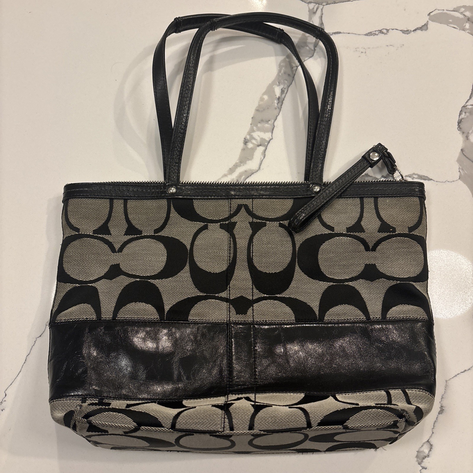 The Coach Signature Khaki Stripe Leather Tote Handbag is a stylish and versatile accessory for women. Made from high-quality leather, this medium-sized bag features a classic rectangular shape with a striped pattern. It comes with double beige handles and gold hardware accents, adding a touch of sophistication to any outfit. The bag includes a zip closure, fabric lining, and a unique bag charm. Perfect for travel, casual outings, or business meetings, this tote exudes timeless elegance and functionality.