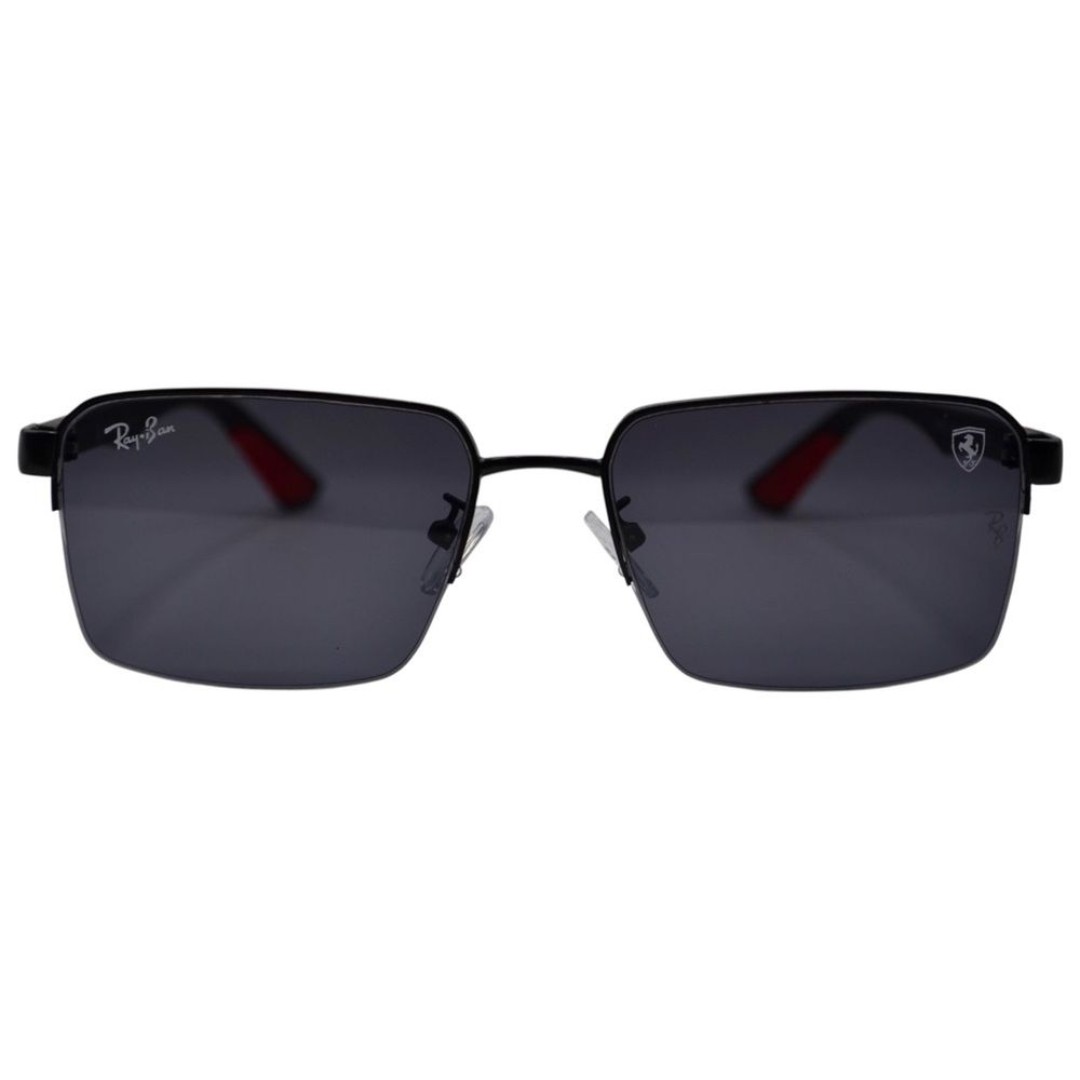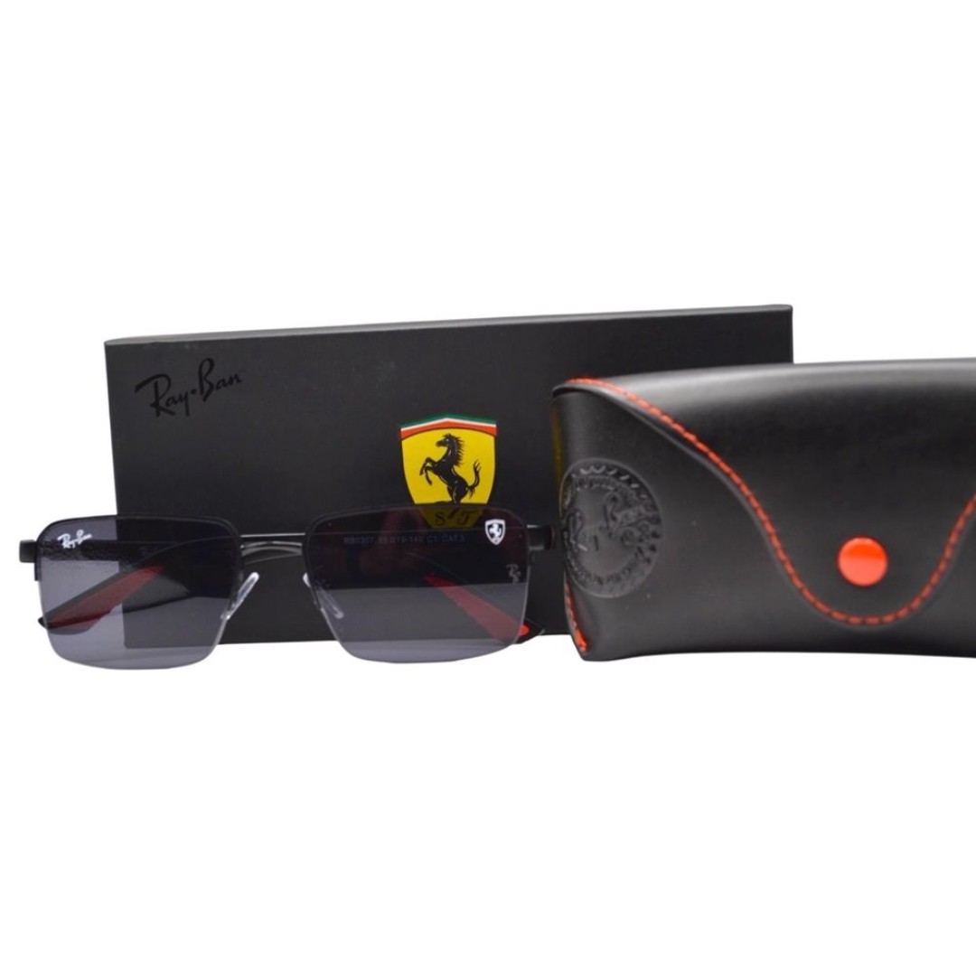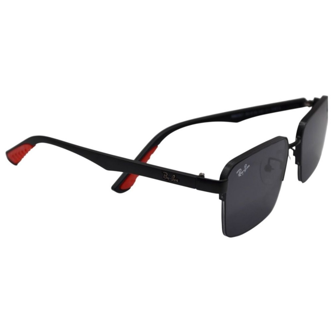 Ray-Ban RB0307 sunglasses feature a sleek semi-rimless black frame with red temple tips and gray lenses. Lightweight, stylish, and made in Italy for everyday comfort.